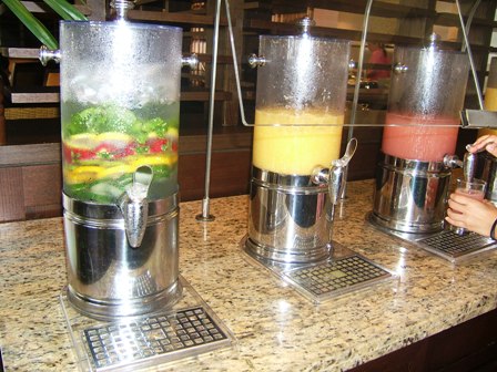 【上左】ドリンクバー。爽やかな朝食のスタートに、ほのかに野菜風味のついたお水。これ最高!