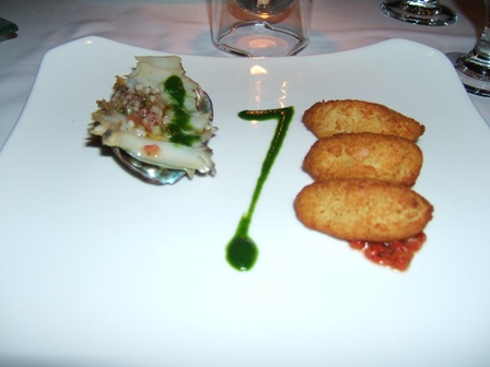 アワビのマリネ、鱈のコロッケ、香菜風味チミチュリ(アルゼンチン発祥のサルサに似たソース)
