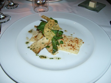 ハワイ島ハマクア産エリンギのグリル、菊芋の薄切り、パルメザンチーズチップス、カリフラワーのピューレ、