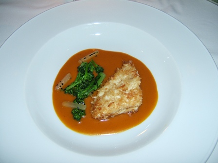 ライスフレーク衣のヒラメ、青パパイヤの煮込み、ブロッコリー、自家製タマリンドカレー