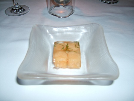 緑色のソースは枝豆の味がしました。 メロンとミント入りシャンパンのゼリー寄せ。