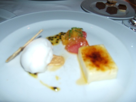 シブースト(果実にカスタードクリームとメレンゲを合わせた軽いクリームをのせ表面に焼き目をつけたタルト)、シトラスの紫蘇仕立て、パッションフルーツソース、ライチシャーベット