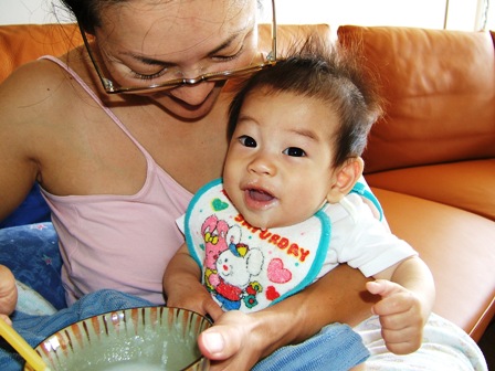 いつもお世話になっている助産師Nさんにモニターしていただきながら、ジェイスもやっと離乳食のスタートです