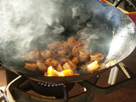 作ってくれました。フィリピン料理だそうです。 えび料理を中華鍋で作ってくれました。