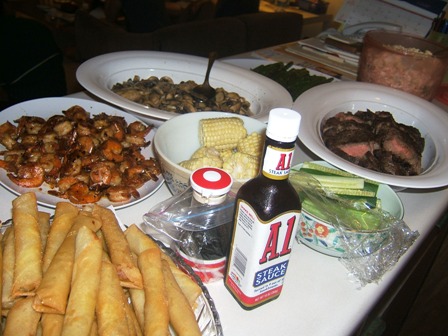 他にポテト&マカロニサラダ、アスパラガスとマッシュルームのソテー、茹でとうもろこし・・・etc. 食卓上はこんなに沢山のお料理で一杯になりました~☆(^▽^)v