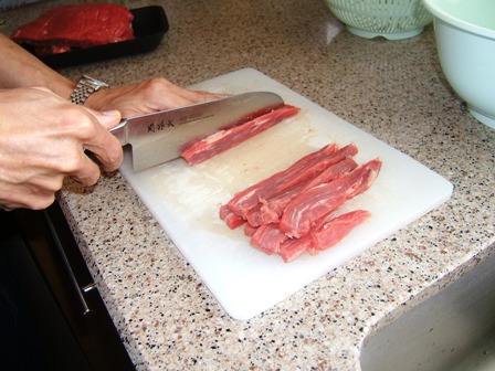 牛もも肉(たたき用・焼肉用)でもOKです。 肉を3~5ミリ幅位での薄切りにします。