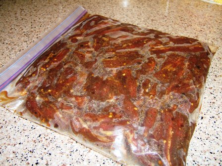 4ビニール袋に調味液と一緒に肉を漬け込み 冷蔵庫で一晩漬け込んだ肉の調味液を