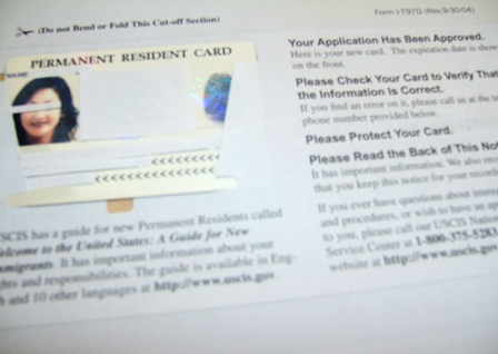 「おめでとう!あなたの申請は許可されました。あなたはアメリカ合衆国の合法な外国人居住者(リーガル・エイリアン)ですよ」というようなことが書いてありました。