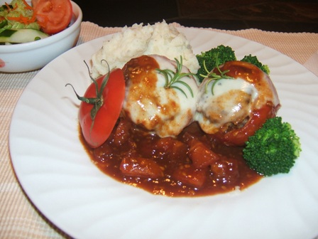 刳り貫いたトマトにハンバーグを詰めてオーブンで焼くだけ。