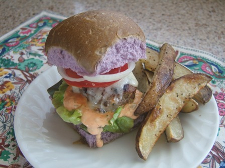 ミニミニハンバーガーとポテト。 ハワイ原産、紫色のタロ芋ロールパン。
