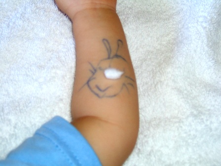 とある予防注射(何だったかしら?)を受ける前にアレルギー反応が出るかを見るために打った注射が痛かったのか、怖かったのか、すんごい勢いで泣き喚いたジェイスの腕に、注射針を打った状態で、うさぎを素早く描き始めたのです。ちょうど鼻にあたる部分が注射をした所で、そこには小さな綿があてられていました。